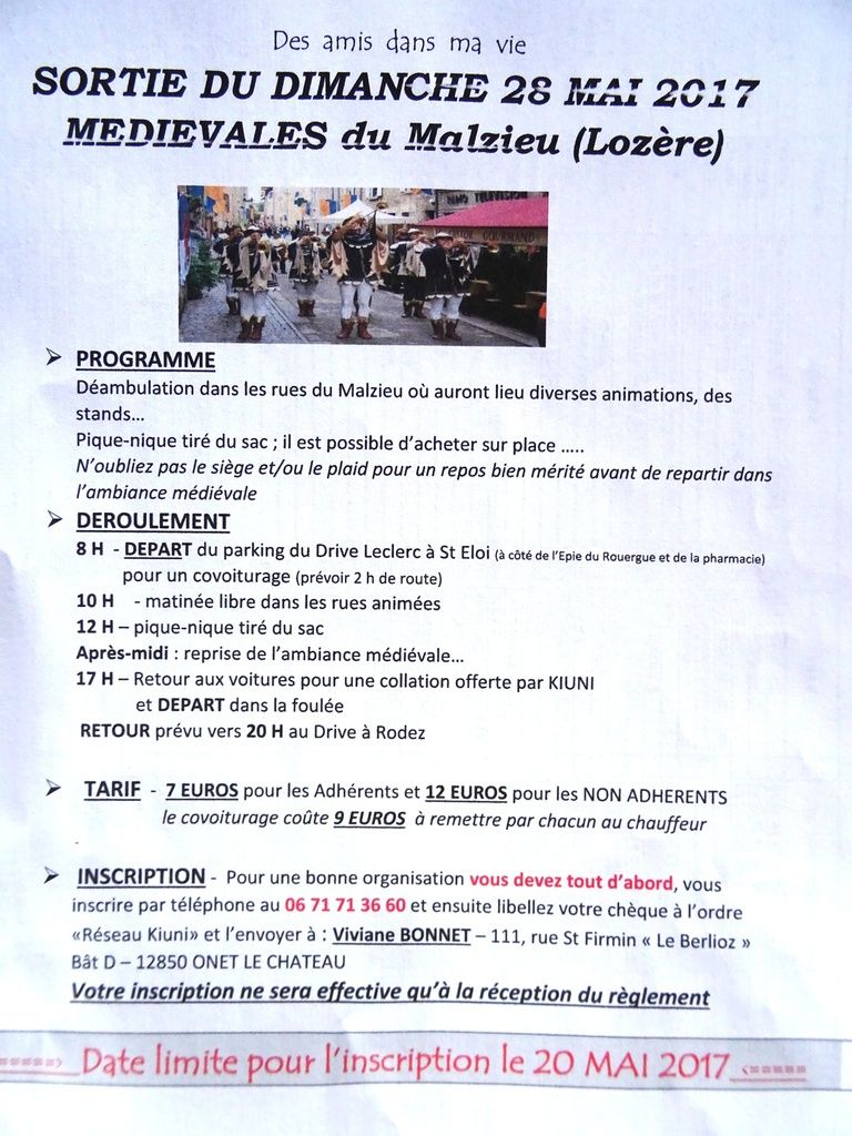 SORTIE DU DIMANCHE 28 MAI MEDIEVALES  du MALZIEU EN LOZERE  INSCRIPTIONS AU 06 71 71 36 60  AVANT LE 20 MAI